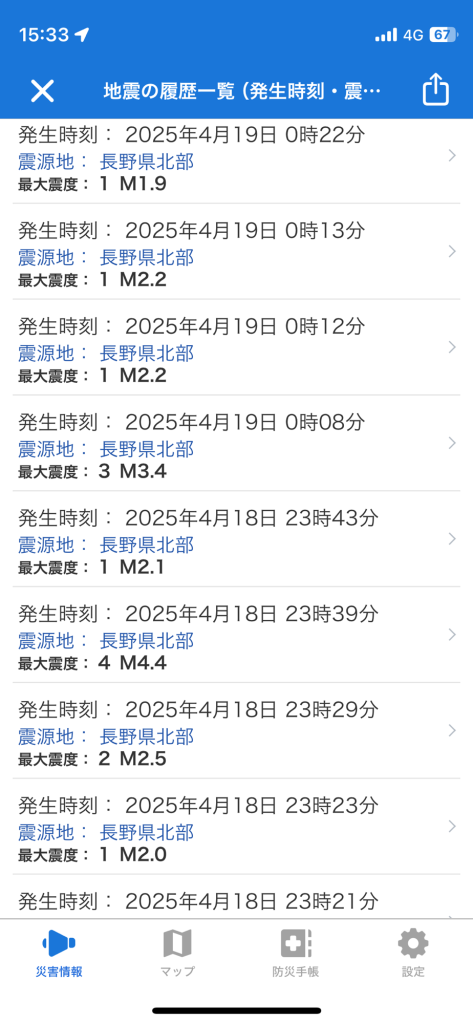 そこから大きな揺れは震度4が一度だけでしたが、